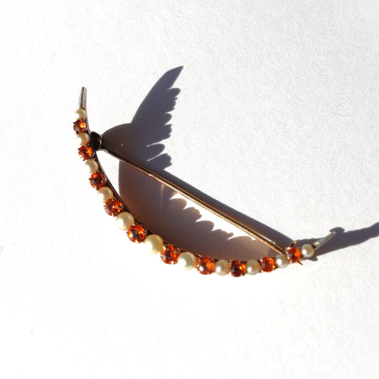 Edwardian 14k Yellow Gold Citrine Seed Pearl Graduated Crescent Brooch c1910