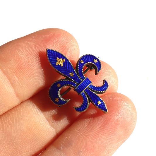 Art Nouveau Sterling Silver Cobalt Guilloche Enamel Fleur de Lis Watch Pendant Brooch