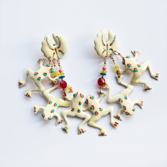 Early Lunch at the Ritz Gold Tone Rare White Enamel Bead 1988 Frog Earrings