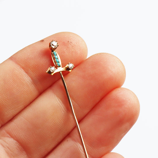 Edwardian 14k Gold Turquoise Diamond Sword Cravat Stick Pin c1910