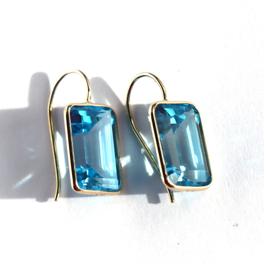 Estate 14k Yellow Gold Emerald Cut 16ct tw Blue Topaz Pierced Earrings