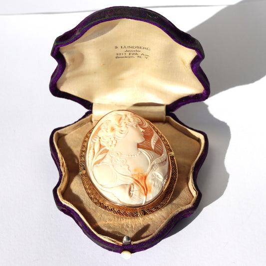 Oversize Art Nouveau 14k Gold Three Color Level Lily Flora Cameo Pendant Brooch