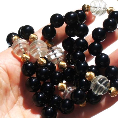 Mid Century Onyx 10k Gold Bead Carved Crystal Opera Length Necklace 32"