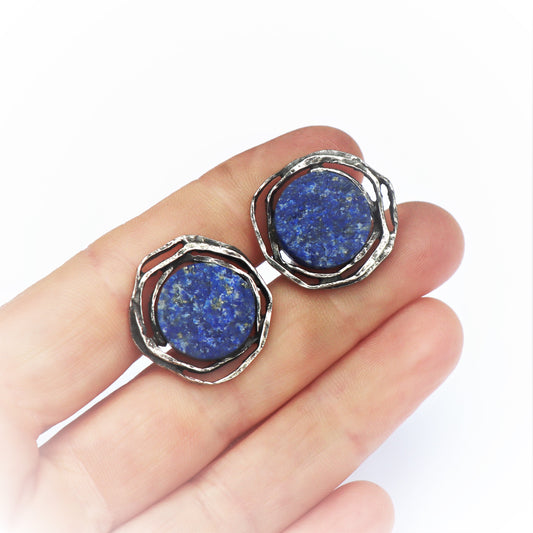 Mid-Century Modern Sterling Silver Continental Brutalist Rough Cut Lapis Lazuli Cufflinks