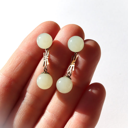Vintage Hong Kong 14k Gold Celedon Green Jade Long Life Pendant Earrings