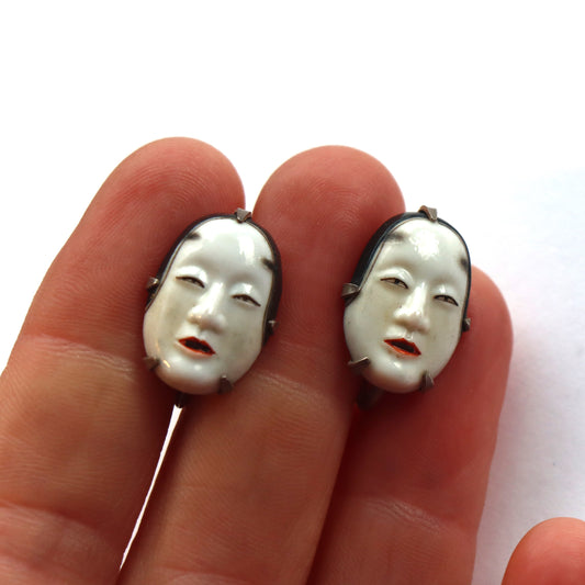 Vintage c1950 Japanese Toshikane Ceramic Noh Mask Screwback Earrings Ko-Omote