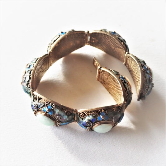 Vintage Chinese Silver Gold Vermeil Jade Jadeite Cloisonne Enamel Butterfly Bracelet