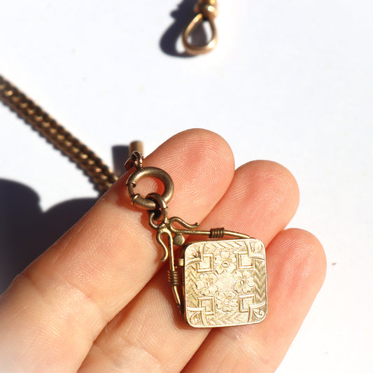 Art Deco Yellow Gold Plate Fancy Pocket Watch Chain Locket Fob Charm and T-Bar c1910-20