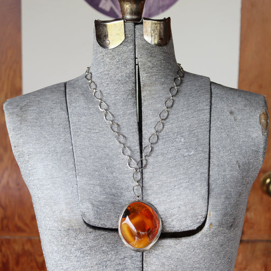 Large mid Century Polish 800 Silver Natural Baltic Freeform Amber Pendant Signed