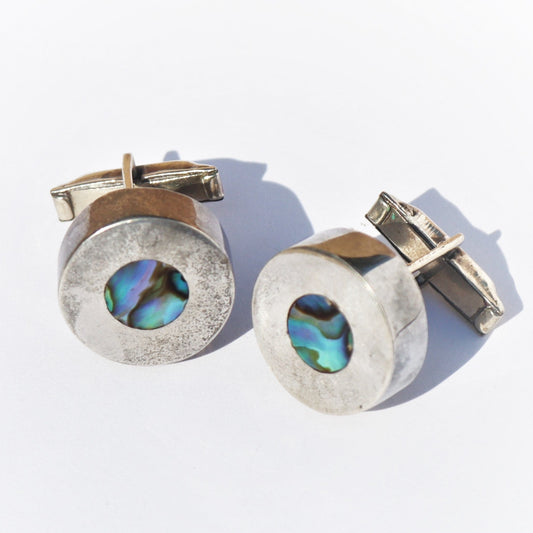 Mid Century Modern Sterling Silver Taxco Abalone Inlay Cufflinks c1970 Signed