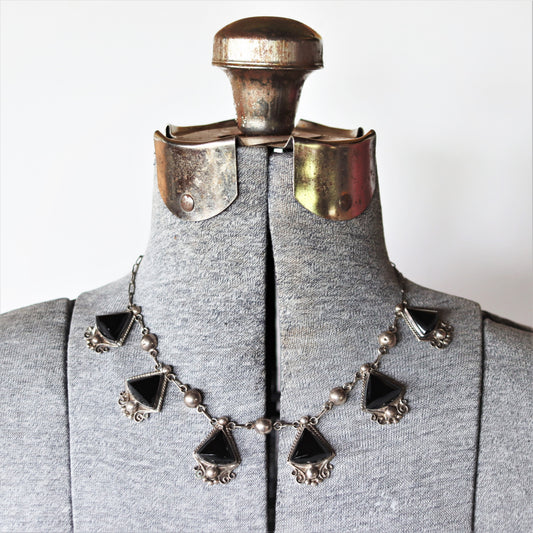 Vintage Mexico Sterling Silver Fancy Cut Black Onyx Pendant Drop Necklace