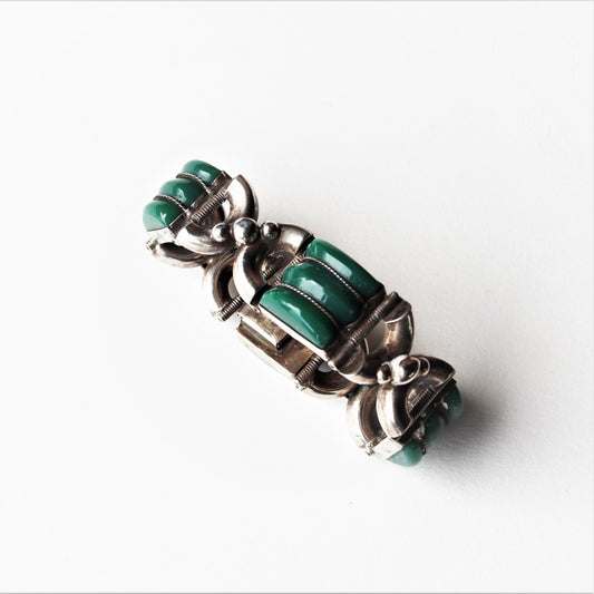 Vintage Mexico Art Deco style Sterling Silver Carved Green Onyx Panel Bracelet