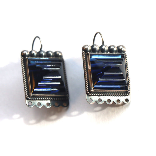 Vintage Mid Century Modern Carved Cobalt Art Glass Mexico Sterling Silver Earrings