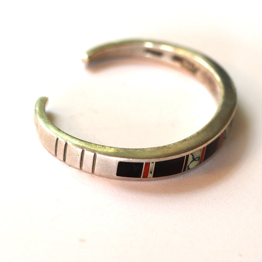 Vintage Navajo Sterling Silver Turquoise & Coral Chip Composite Inlay Asymmetrical Cuff Bracelet Signed