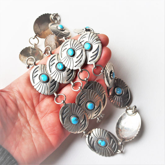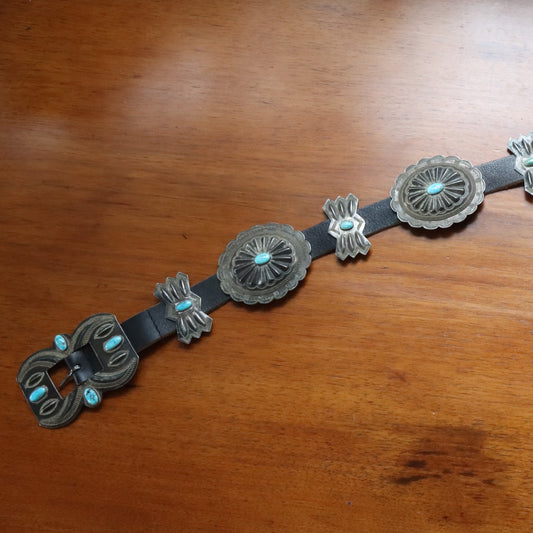 Art Deco Navajo Coin to Sterling Silver Kingman Turquoise Concho Butterflies and Buckle c1930-40