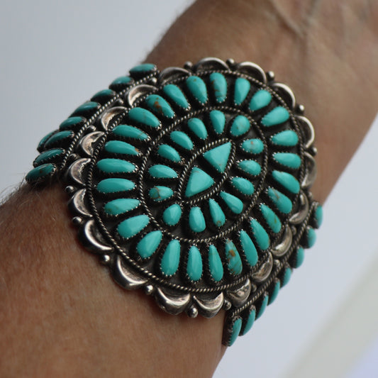 Vintage Large Zuni Sterling Silver Petit Point Turquoise Cuff Bracelet Signed HB